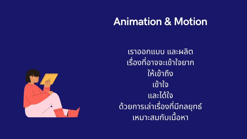 Communication design & Production เราจัดการกับปัญหาที่ยากลำบากด้วยผลงานสื่อสร้างสรรค์ เช่น วิดีโอ กราฟิก ชุดเครื่องมือ หลักสูตรการศึกษารวมถึงการถ่ายทอดสดที่ขับเคลื่อนความเข้าใจอย่างลึกซึ้งเพื่อสร้างความเปลี่ยนแปลงในแก่สังคมไทย
